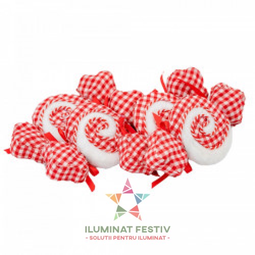 Etichete: Decoratiune brad in forma de bomboana, culoare alb cu rosu, dimensiune: 16.5x2.5x8.5cm, 4 buc/ set MI-513