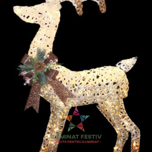 Ren pe cadru metalic cu tesatura din ratan, 100 led-uri lumini albe calde + transformator.