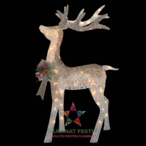 Ren pe cadru metalic cu tesatura din ratan, 100 led-uri lumini albe calde + transformator.